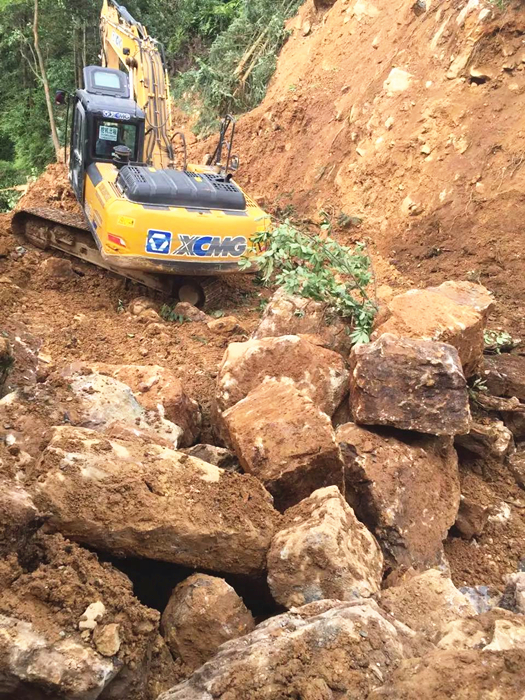 7月13日早7點(diǎn),響徹云霄的鞭炮聲過(guò)后,所有機(jī)械開(kāi)始作業(yè)。挖掘機(jī)工作7小時(shí)推進(jìn)到6米的時(shí)候,山體出現(xiàn)了滑坡,好在提前做了排險(xiǎn)處理,未出現(xiàn)任何施工事故。道路基線均處在滑坡地帶、山體內(nèi)所含石料60%為整石、40%為孤石含雜松軟黏土,這為施工帶來(lái)了很大難度,工作進(jìn)度也非常緩慢,到了晚上22點(diǎn),道路才勉強(qiáng)推進(jìn)到9米。