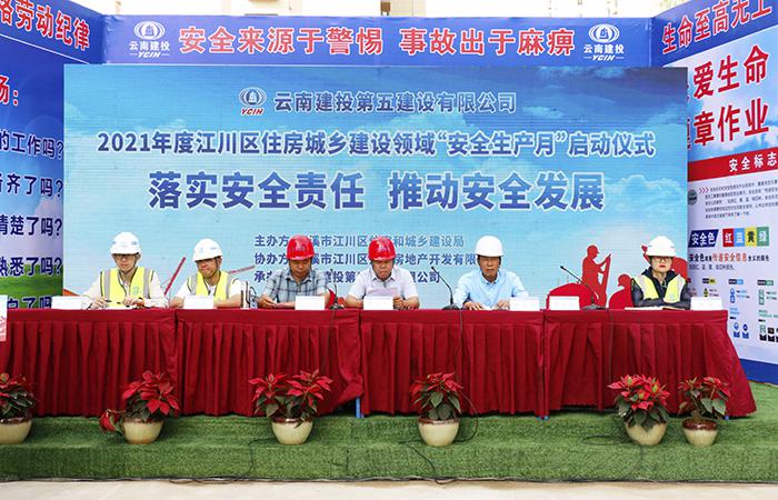 6月15日, 由玉溪市江川區(qū)住房和城鄉(xiāng)建設局主辦、玉溪市江川區(qū)興民房地產開發(fā)有限公司協(xié)辦,云南建投第五建設有限公司五〇一直管部承辦的江川區(qū)住房城鄉(xiāng)建設領域“安全生產月”啟動儀式在書香苑二期項目舉行。玉溪市江川區(qū)住建局局長李竹貴、玉溪市江川區(qū)興民房地產開發(fā)有限公司經理張文祥出席本次活動。參加本次活動的還有江川區(qū)住建局、質安站等單位,以及江川區(qū)同行業(yè)企業(yè)的代表共計100人。