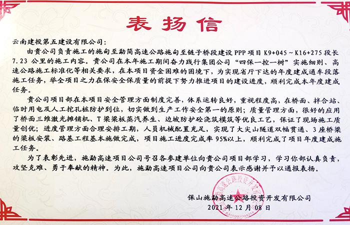 近期,施鏈高速二分部在施工期間連獲總承包二部“先進(jìn)單位 流動(dòng)紅旗”;施甸縣姚關(guān)鎮(zhèn)山邑村民委員會(huì)贈(zèng)“搭建民心工程 接通天長(zhǎng)地久”錦旗;收到業(yè)主單位保山施勐高速公路投資開發(fā)有限公司《表?yè)P(yáng)信》等3個(gè)獎(jiǎng)勵(lì),項(xiàng)目工作得到了上級(jí)單位、地方單位的充分肯定。