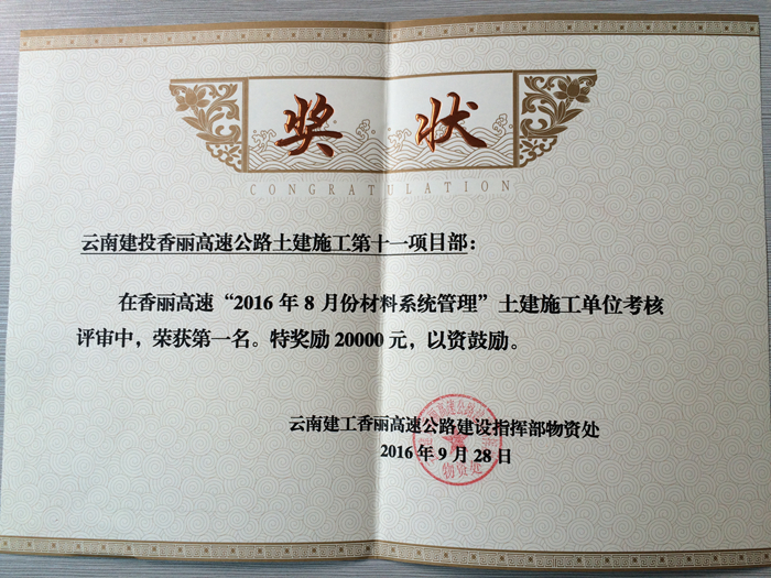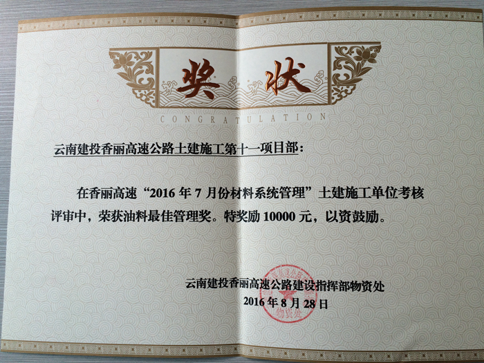 項(xiàng)目部在2016年獲得產(chǎn)值累計(jì)位列全線第一名,獎(jiǎng)勵(lì)人民幣30萬元;項(xiàng)目部按期完成主線施工便道貫通,給予全線通報(bào)表?yè)P(yáng),獎(jiǎng)勵(lì)人民幣10萬元,香麗高速全線13家土建參建單位目前只有第三項(xiàng)目部和第十一項(xiàng)目部主線施工便道順利貫通;項(xiàng)目部的物資部在指揮部“7月份材料系統(tǒng)管理”考核評(píng)審中榮獲油料最佳管理獎(jiǎng),獎(jiǎng)勵(lì)10000元,在“8月份材料系統(tǒng)管理”考核評(píng)審中榮獲第一名,獎(jiǎng)勵(lì)20000元。項(xiàng)目部在2016年共獲得4個(gè)獎(jiǎng)項(xiàng),共計(jì)43萬元的獎(jiǎng)金。項(xiàng)目部將再接再厲,持續(xù)前進(jìn)。