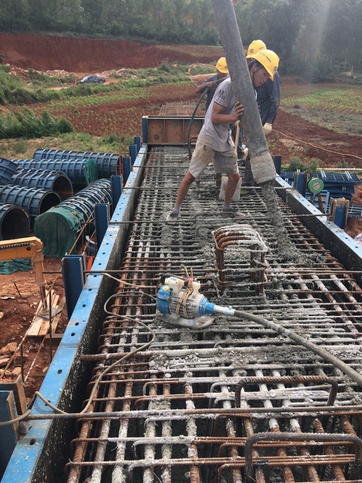 大木寨1號中橋單幅全長132.16米,橋面凈寬22米,為上跨改移地方路而設(shè),共有橋墩20個,蓋梁4個。此次順利澆筑完成的蓋梁為大木寨1號中橋右幅1#墩蓋梁。該蓋梁長度 11.2米,寬1.9米,高1.6 米,歷經(jīng)4個小時完成澆筑,澆筑C30混凝土 33立方米。項目部為了確保蓋梁首件工程的質(zhì)量,編制了詳細的施工方案,在原材料質(zhì)量控制的基礎(chǔ)上,對蓋梁施工全過程進行嚴(yán)格的管控。