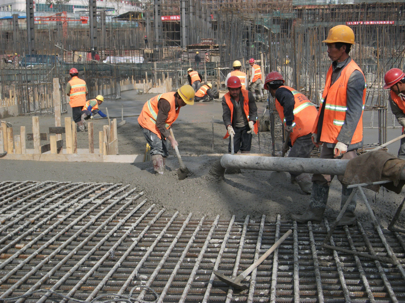圖為混凝土澆筑施工現(xiàn)場(chǎng)