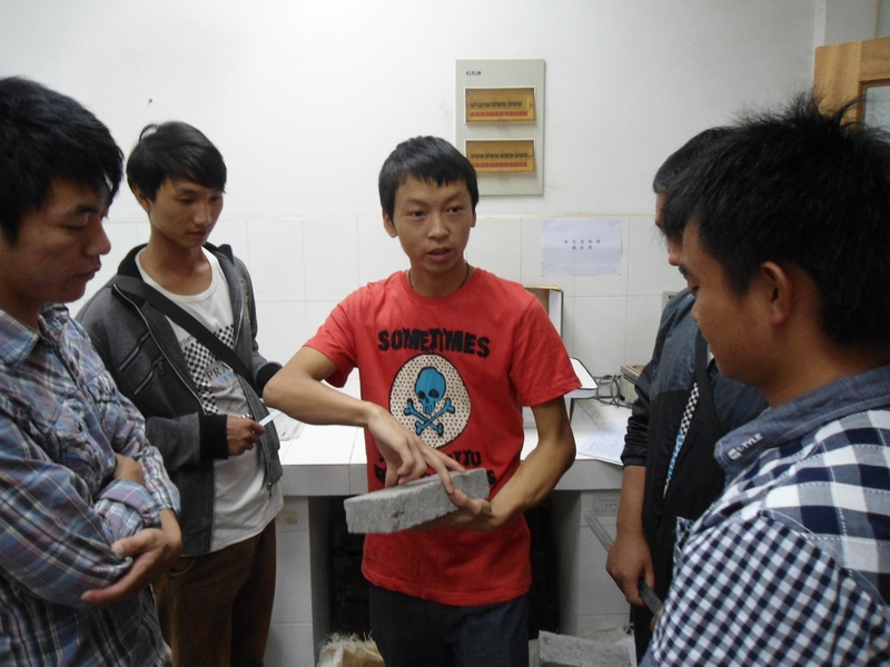 圖為試驗(yàn)計(jì)量中心工作人員為學(xué)員講解混凝土實(shí)心磚的檢測(cè)過(guò)程